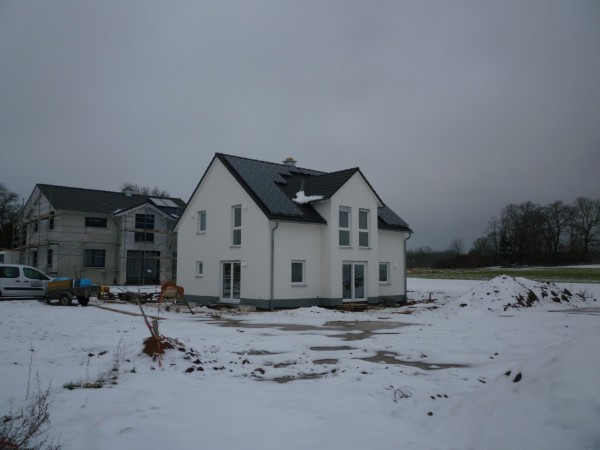 Ein Einfamilienhaus im klassischen fränkischen Stil mit Satteldach und einem kleinen Erker.